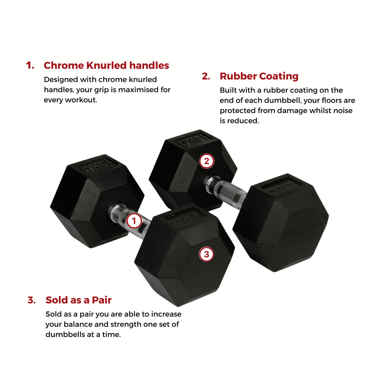 The rubber coating increases durability as well as protecting floors and reducing noise. The hexagonal design stops the dumbbells rolling away during training and increases your training options. Available in a range of weights broadening your exercise potential with 1- 20kg options to scale the difficulty.