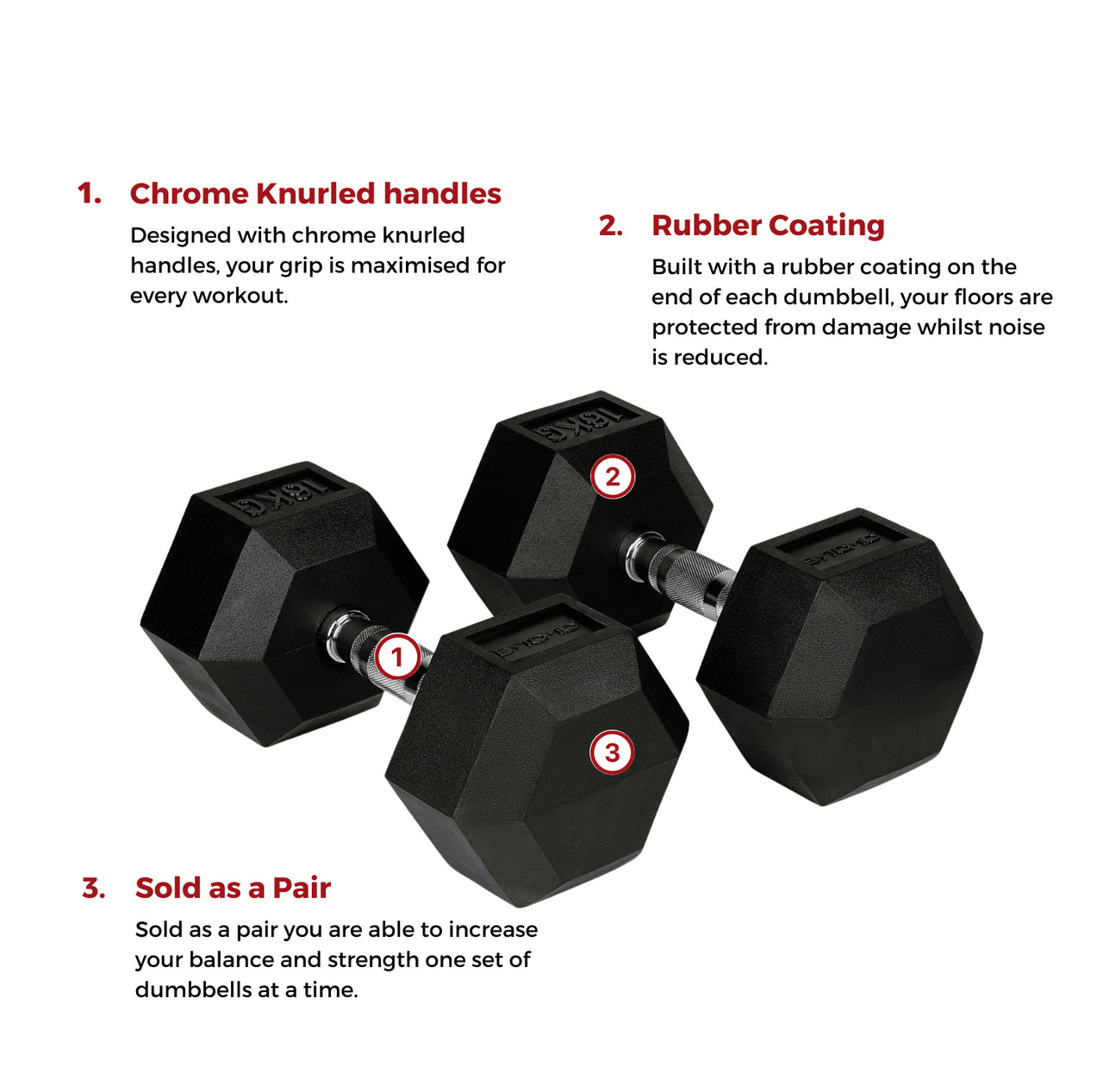 The rubber coating increases durability as well as protecting floors and reducing noise. The hexagonal design stops the dumbbells rolling away during training and increases your training options. Available in a range of weights broadening your exercise potential with 1- 20kg options to scale the difficulty.
