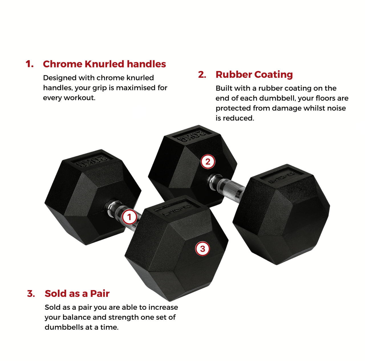 The rubber coating increases durability as well as protecting floors and reducing noise. The hexagonal design stops the dumbbells rolling away during training and increases your training options. Available in a range of weights broadening your exercise potential with 1- 20kg options to scale the difficulty.