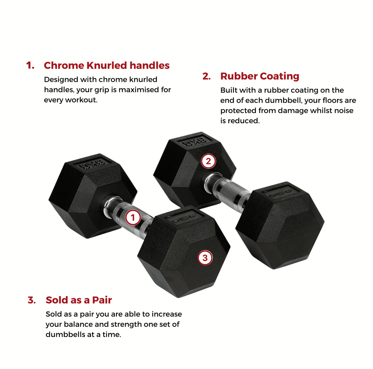 The rubber coating increases durability as well as protecting floors and reducing noise. The hexagonal design stops the dumbbells rolling away during training and increases your training options. Available in a range of weights broadening your exercise potential with 1- 20kg options to scale the difficulty.