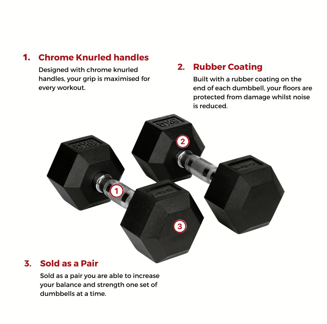 The rubber coating increases durability as well as protecting floors and reducing noise. The hexagonal design stops the dumbbells rolling away during training and increases your training options. Available in a range of weights broadening your exercise potential with 1- 20kg options to scale the difficulty.