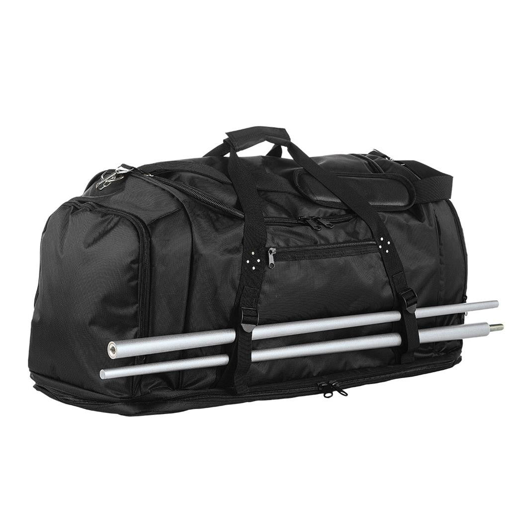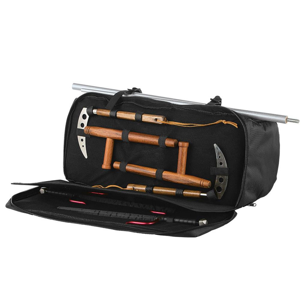 This durable bag is designed for transported martial arts weapons, with front weapon straps, interior compartments for throwing stars, water bottles and shoes, a handy key clip, and a bottom zippered panel that opens for storage of one pair each of the following weapons: sai, tonfas, kamas, and escrima.