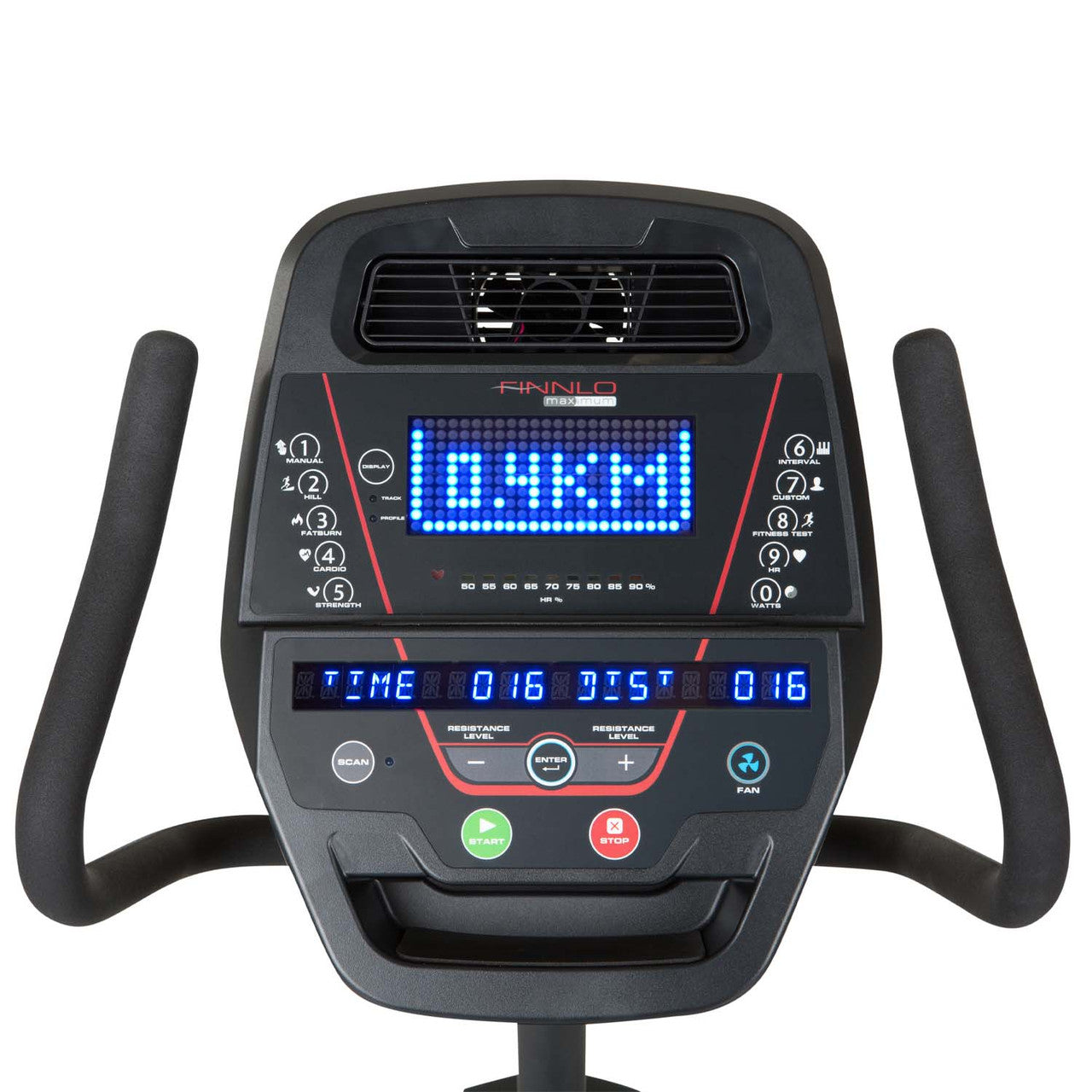 All training data is presented clearly on the large 24x10 dot matrix LED display. You can even do a fitness test on the FINNLO MAXIMUM RB 8000 recumbent bike.