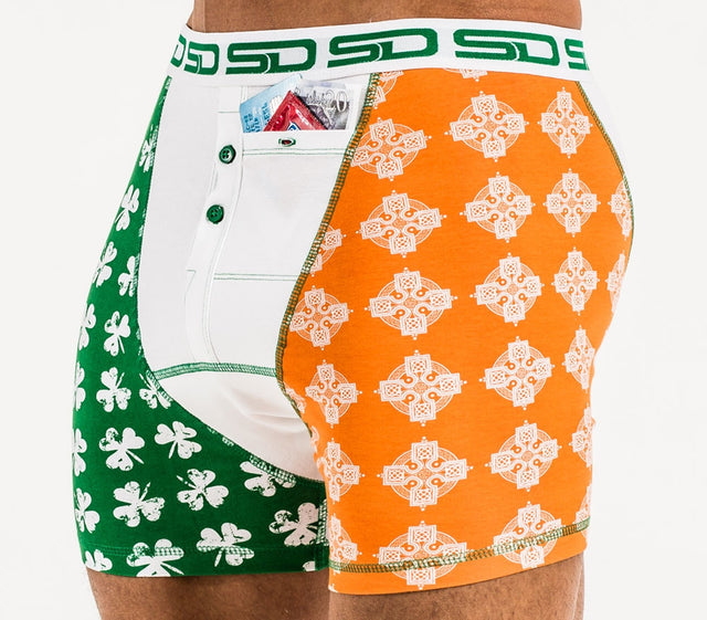 Irish design boxer shorts, Ireland inspired with the trademark tricolour of green, white and orange. Clover pattern on the green leg and Celtic cross pattern on the orange.